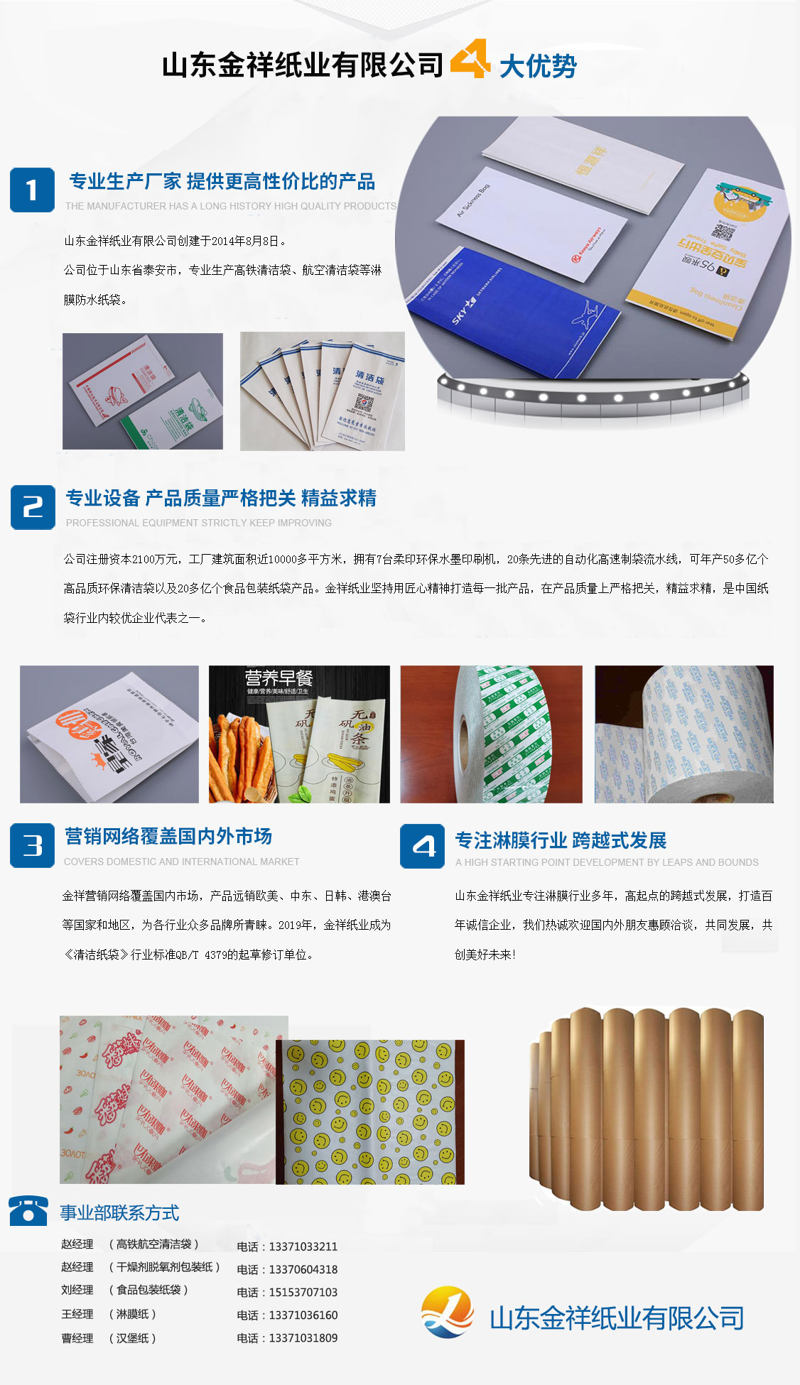 山東金祥紙業(yè)有限公司創(chuàng)建于2014年8月8日,公司位于山東泰安,專業(yè)生產(chǎn)高鐵清潔袋、航空清潔袋等淋膜防水紙袋。公司注冊資本2100萬元,工廠建筑面積近10000多平方米,擁有7臺柔印環(huán)保水墨印刷機,20條先進的自動化高速制袋流水線,可年產(chǎn)50多億個高品質(zhì)環(huán)保清潔袋以及20多億個食品包裝紙袋產(chǎn)品。金祥紙業(yè)堅持用匠心精神打造每一批產(chǎn)品,在產(chǎn)品質(zhì)量上嚴格把關(guān),精益求精,是中國紙袋行業(yè)內(nèi)較優(yōu)企業(yè)代表之一。金祥營銷網(wǎng)絡(luò)覆蓋國內(nèi)市場,產(chǎn)品遠銷歐美、中東、日韓、港澳臺等國家和地區(qū),為各行業(yè)眾多品牌所青睞。2019年,金祥紙業(yè)成為《清潔紙袋》行業(yè)標(biāo)準(zhǔn)QB/T 4379的起草修訂單位。